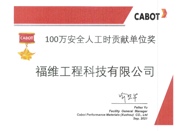 在项目团队的努力之下,福维工程受到了业主团队的一致认可和高度评价。项目执行期间,福维团队认真管理,始终秉承:“全力准备、用心贯彻、勇于干预”的原则,确保每一天每一位员工都安全工作、平安回家,做到了零伤害、无重大隐患、无损失工时。2021年5月8日,卡博特项目现场喜迎50万安全工时庆典,并且于2021年9月23日顺利达到100万安全工时,截至目前,项目共计取得了约190万安全工时。为表彰福维工程的卓越管理成就,卡博特向福维工程颁发了“贡献单位奖”。